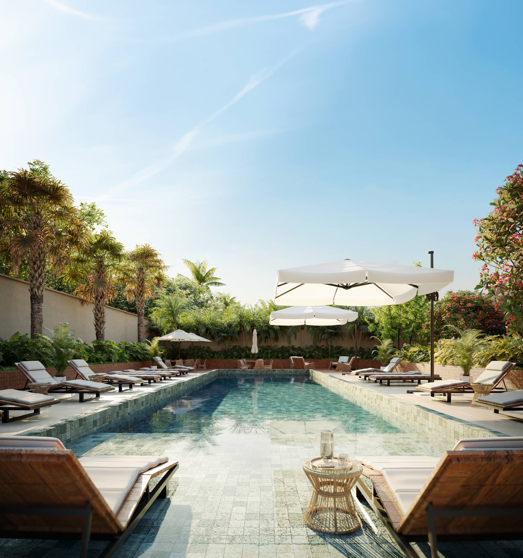 Ambiente entregue mobiliado e equipado, com vista para a piscina.